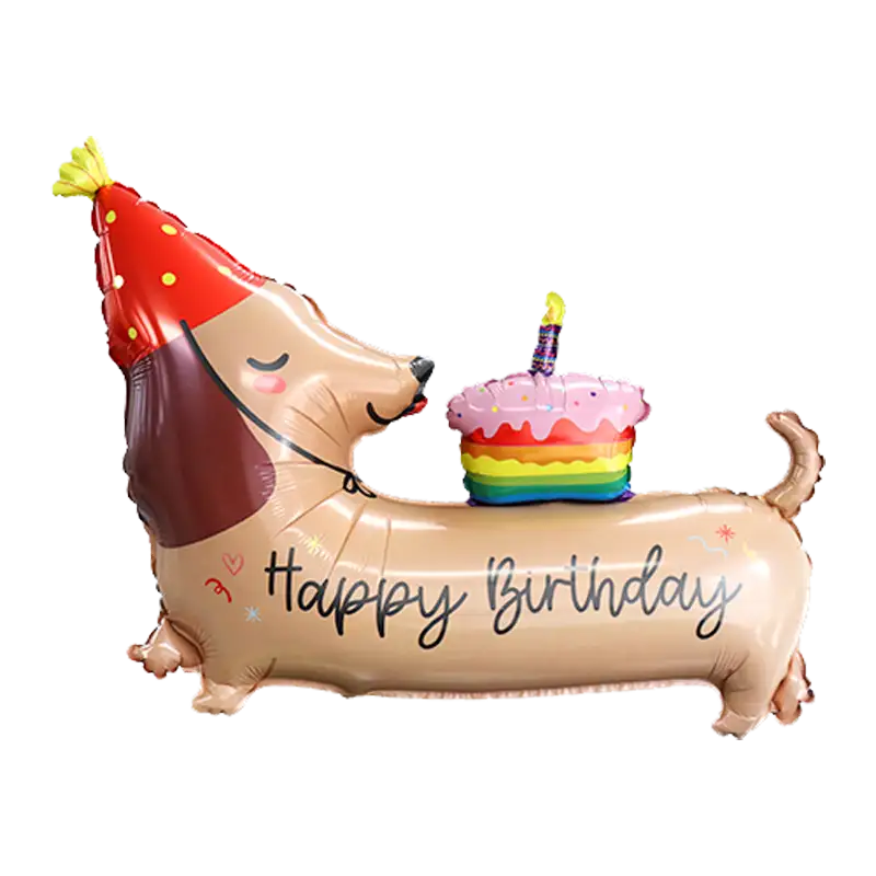 パーティーハットをかぶったダックスフントが、虹色のバースデーケーキを背負っている、とびきりキュートな誕生日バルーンです。