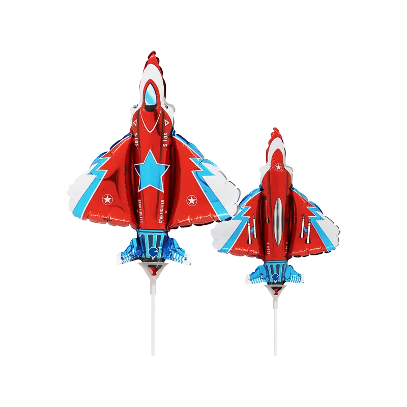 鮮やかなレッドとブルーの配色が目を引く、スターファイター(戦闘用宇宙船)のバルーンです。ヘリウムを入れても浮きません。