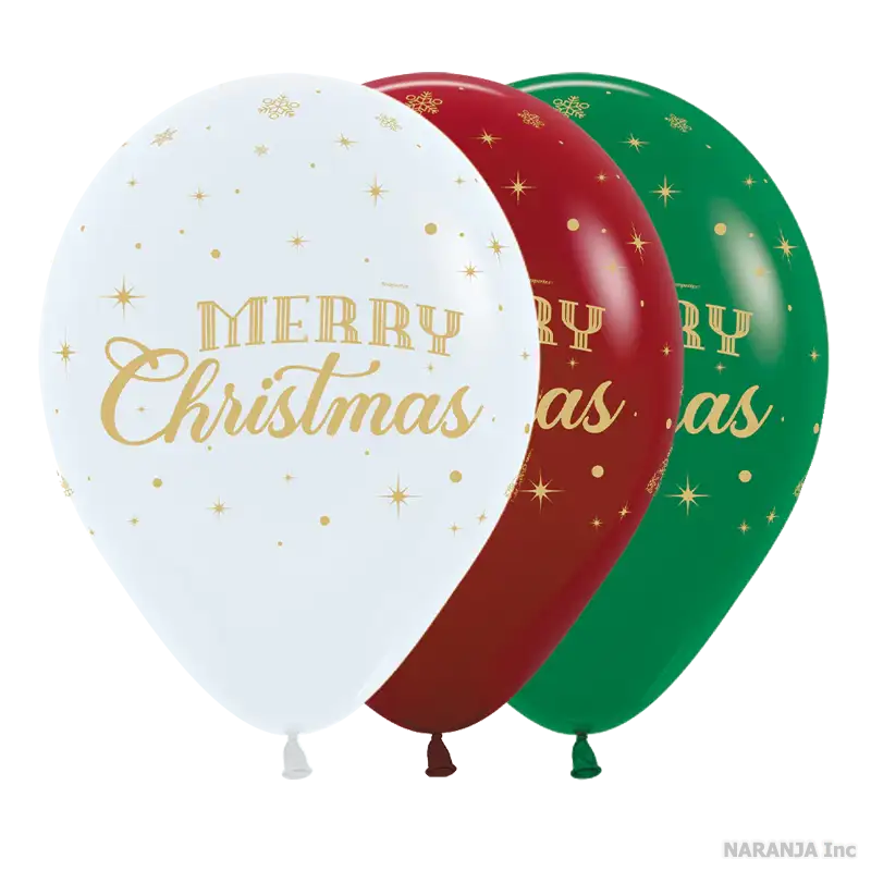 ファッションカラーのホワイト、インペリアルレッド、フォレストグリーンの3色のバルーンに金色の文字で「Merry Christmas」と書かれています。