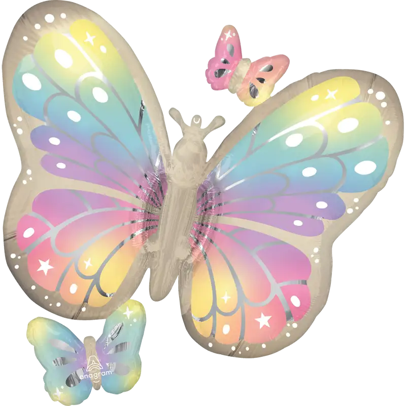 パステルカラーのグラデーションが美しい、蝶のバルーンです。