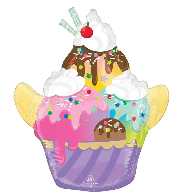 ボリュームたっぷりのアイスクリームに、とろけるチョコソースやカラフルなトッピングが映える、ポップなデザインです。