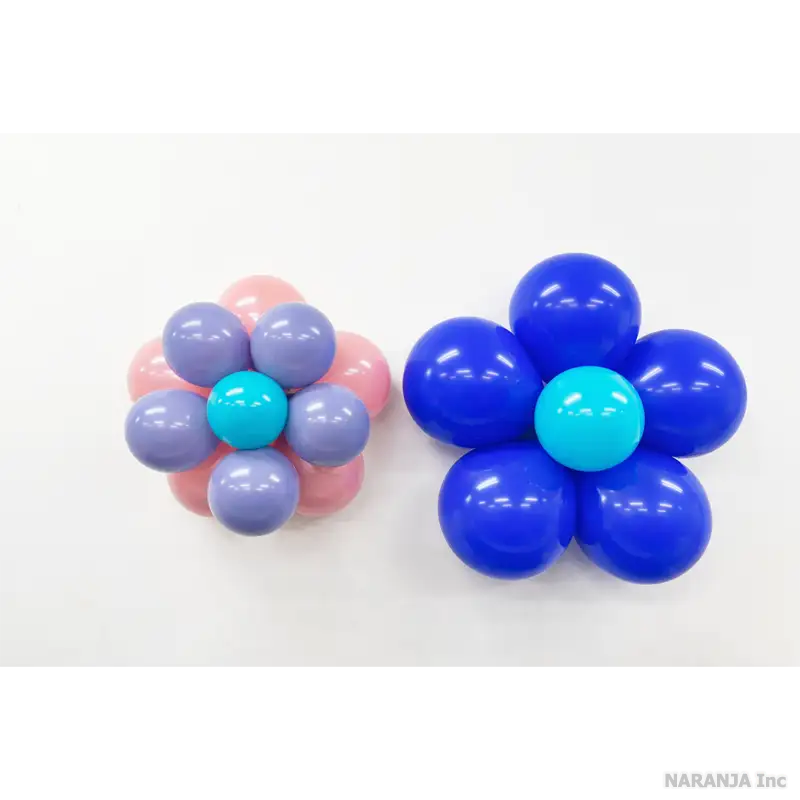 5インチのバルーンだと小さめのお花が、12インチのバルーンだと大き目のお花ができます。ブルーのお花は、外側の部分にだけ取り付けて作成しています。