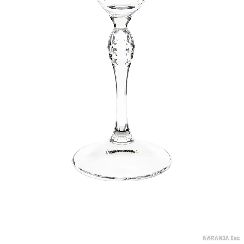 ステムの上部には、光の反射や屈折を巧みに利用して輝きを一層引き立てる装飾が施されています。 また、ステムの下部には縦方向のライン状の装飾があり、こちらも光を受ける角度によって華やかにきらめくようデザインされています。