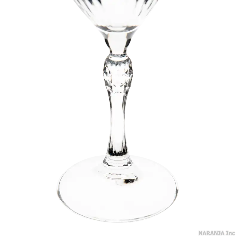ステムの上部には、光の反射や屈折を巧みに利用して輝きを一層引き立てる装飾が施されています。 また、ステムの下部には縦方向のライン状の装飾があり、こちらも光を受ける角度によって華やかにきらめくようデザインされています。