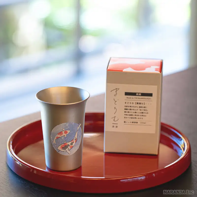 新潟県発祥の「錦鯉」をモチーフにしたまどろむ酒器シリーズの第6作。新潟が誇る金属加工技術と「錦鯉」を掛け合わせたMADE IN NIIGATAの一品です。水彩画をイメージとした淡い色付きが特長となっています。