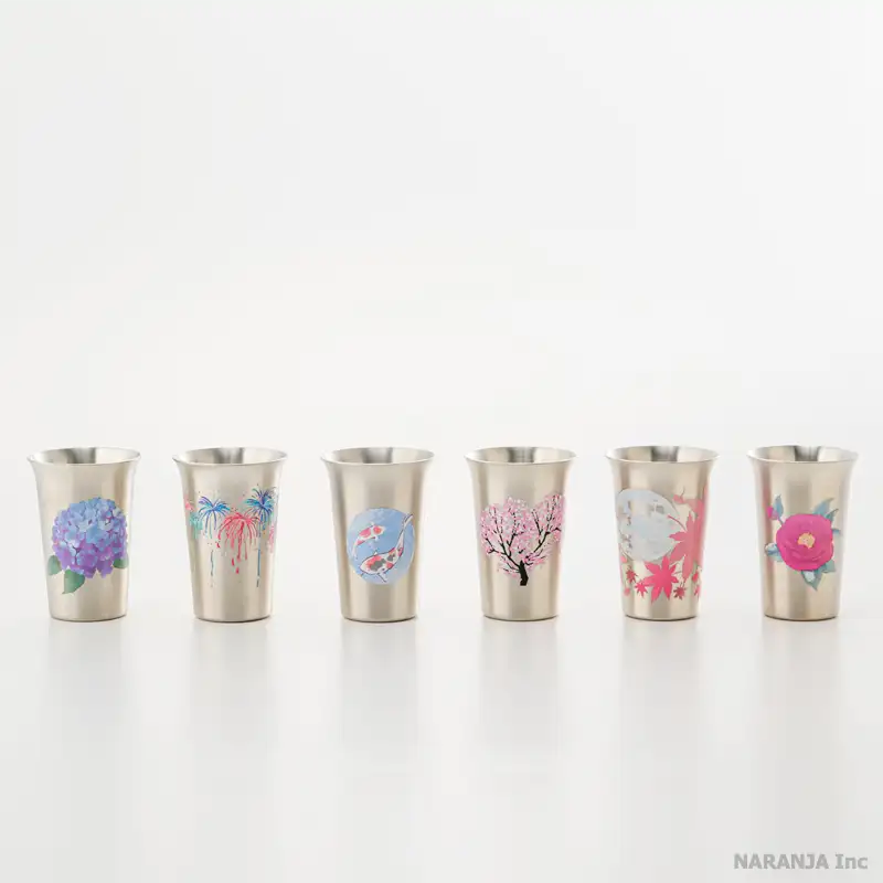 新潟県燕市の業務用厨房製品メーカー、スリースノーによる金属製のシンプルな酒器です。16℃以下で色づくイラストが描かれたタイプです。